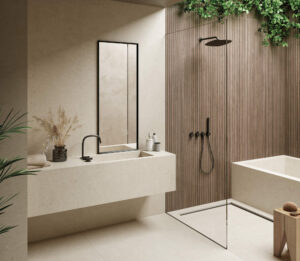 Die mega-tegelplaten kan je meteen gebruiken aan de wand van je douche, voor een voegloos (en zorgeloos) effect!